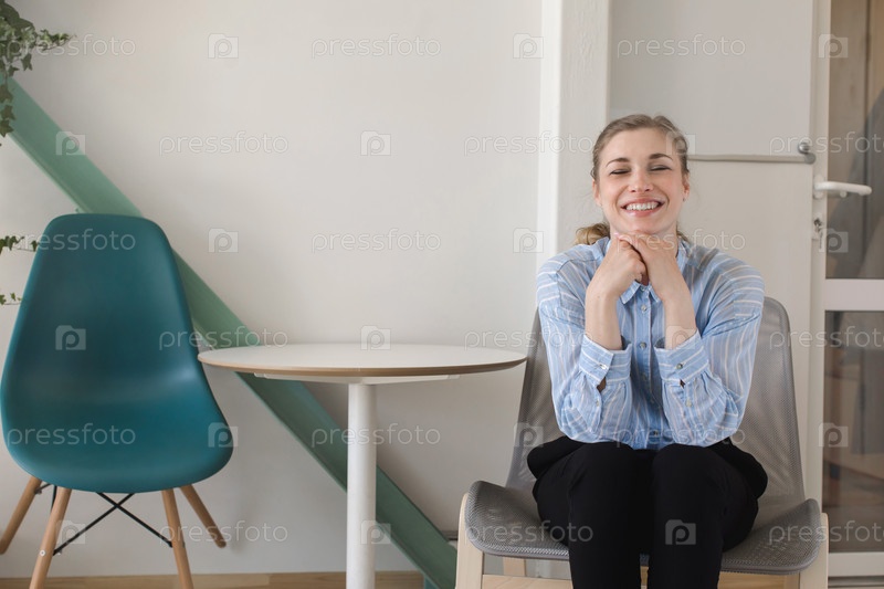 Улыбающаяся молодая женщина, сидя на стуле