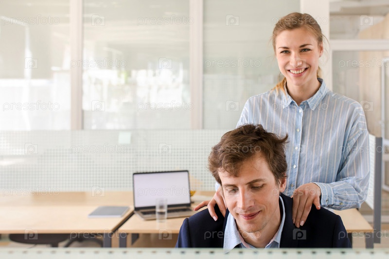 Молодая женщина, положила руки на плечи мужчины в офисе