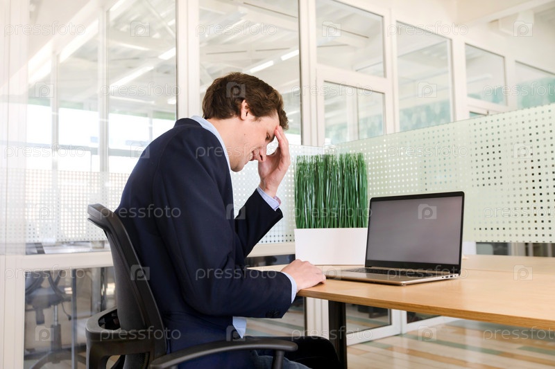 Задумчивый человек, используя ноутбук в офисе