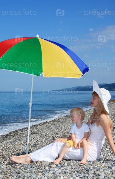 Мама с ребенком под цветным зонтом на пляжу