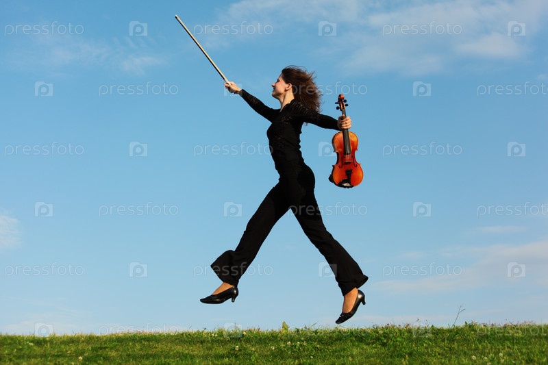 Девушка со скрипкой бежит по траве