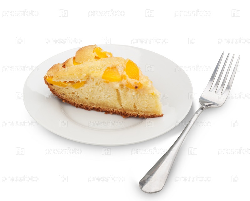 Кусок пирога с персиками на тарелке на белом фоне. Изолировано