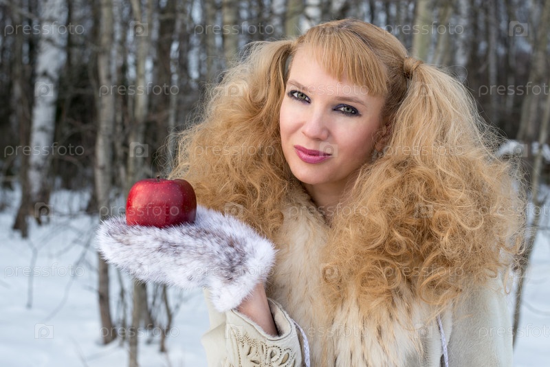 Улыбающаяся молодая женщина с необычной прической показывает яблоко