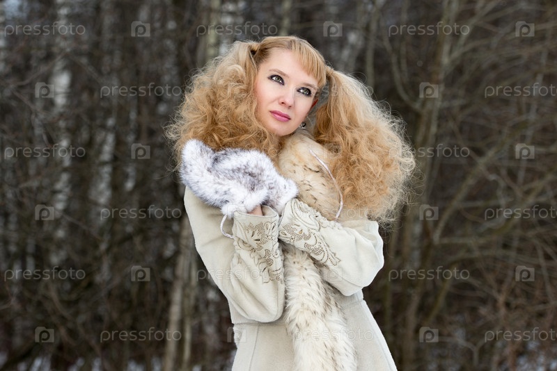Мечтательная симпатичная молодая женщина в зимнем лесу