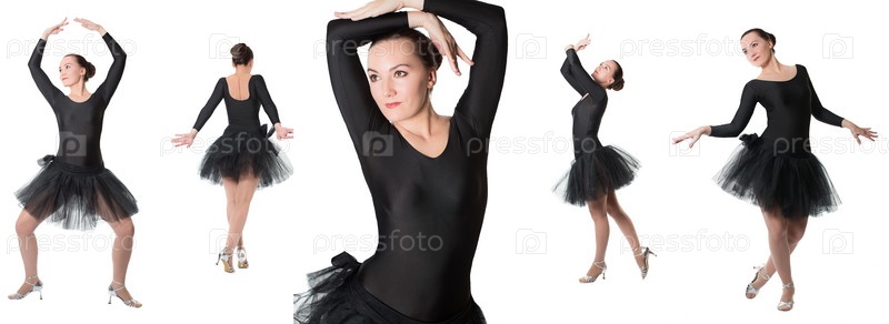 Коллаж, балерина в разных позах на белом фоне. Концепция спорта и здоровья