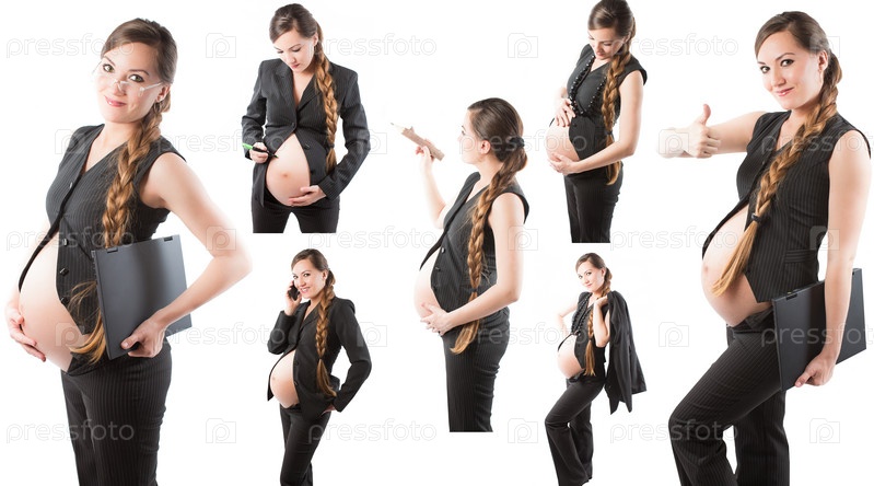 Коллаж, беременная бизнес-леди в деловом костюме с ноутбуком и мобильным телефоном на белом фоне
