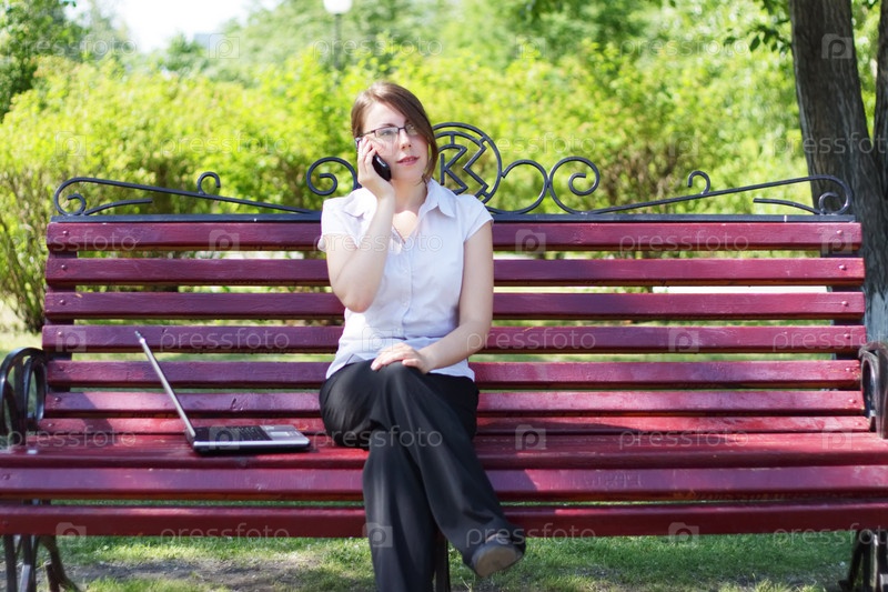 Деловая девушка с ноутбуком на скамейке