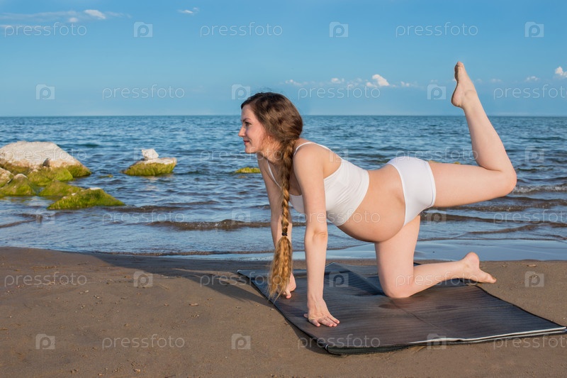 Беременная женщина в спортивном бюстгальтере занимается йогой на море