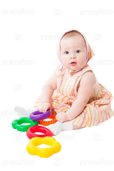 Девочка играет с кольцами пирамидки, изолированная на белом фоне