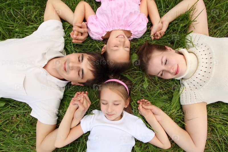 Родители с детьми лежат на траве