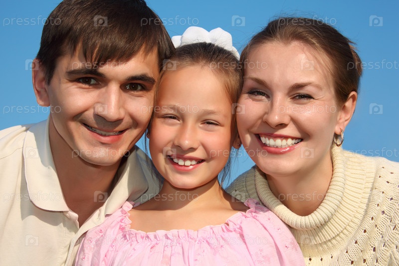 Родители с дочкой на фоне голубого неба