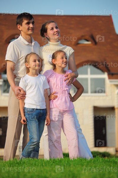 Родители с детьми на фоне дома