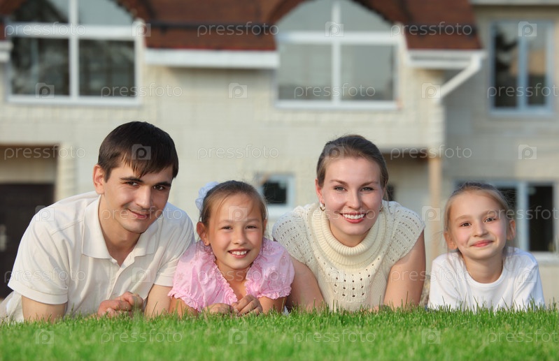 Родители с детьми лежат на траве перед своим новым домом