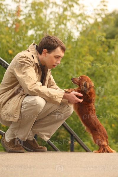 Молодой человек играет с таксой