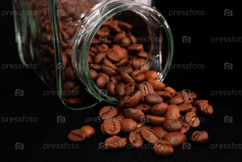 Зерна кофе в банке и возле нее крупным планом