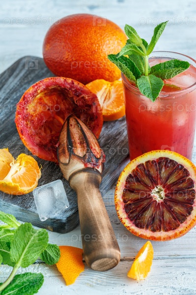 Ледяной сок из кровяного апельсина и цитрусового пресса