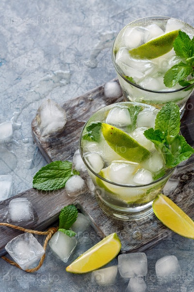 Лимонад с мятой, нарезами лайма и кубиками льда