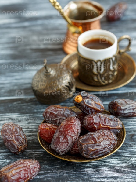 Даты на тарелке, медные цезве и черный кофе