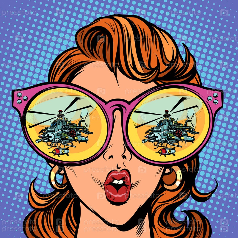 Женщина с солнцезащитными очками. военный вертолет в отражении