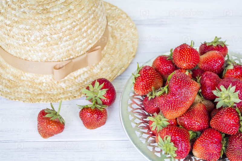 клубника и соломенная шляпа. летний натюрморт. ягоды на белом деревянном фоне