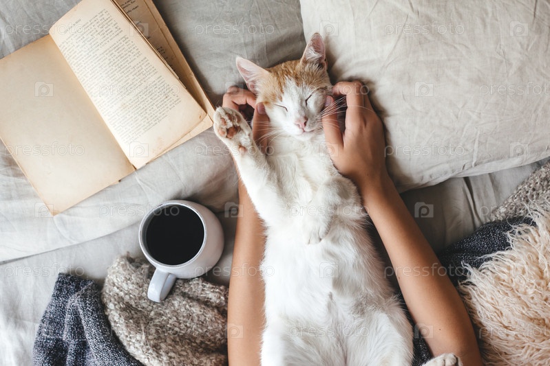Концепция Hygge с кошкой, книгой и кофе в кровати