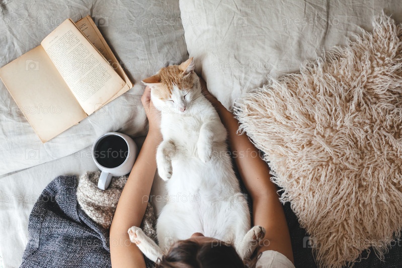 Концепция Hygge с кошкой, книгой и кофе в кровати