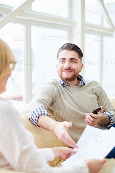Улыбающийся человек консультируется с женщиной