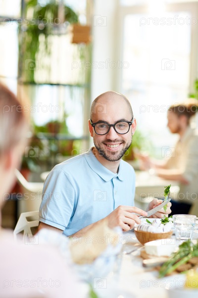Человек улыбается и делает салат