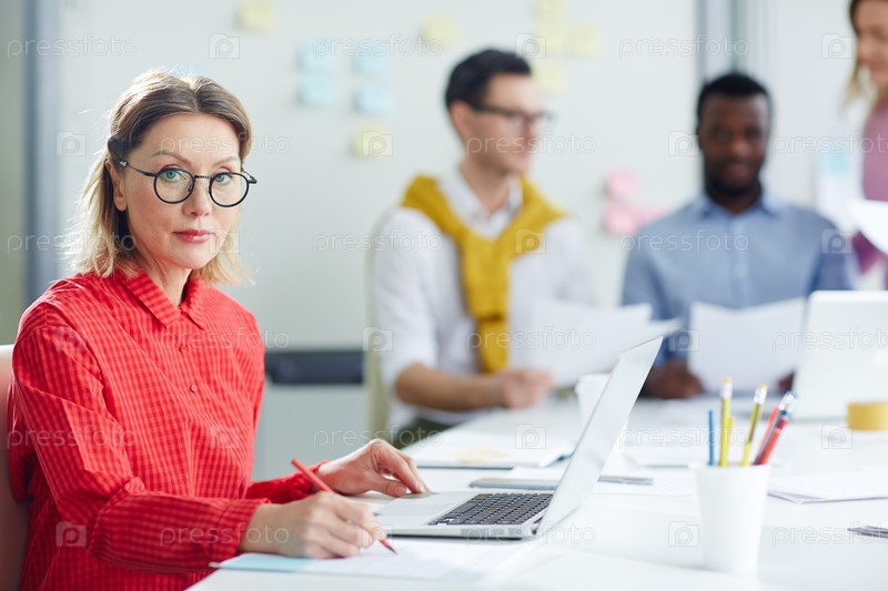 Женщина в очках и красной рубашке за столом