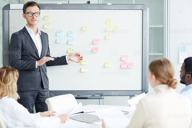 Сотрудник показывает презентацию на доске