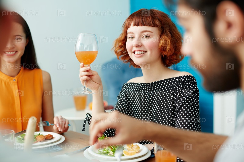 Красивая женщина, держащая стакан во время обеда с друзьями