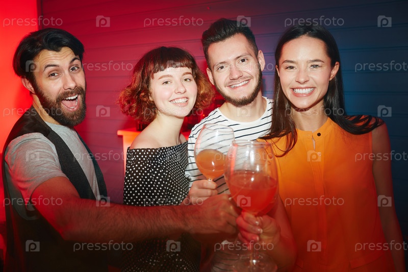 Счастливые друзья на вечеринке в красном свете