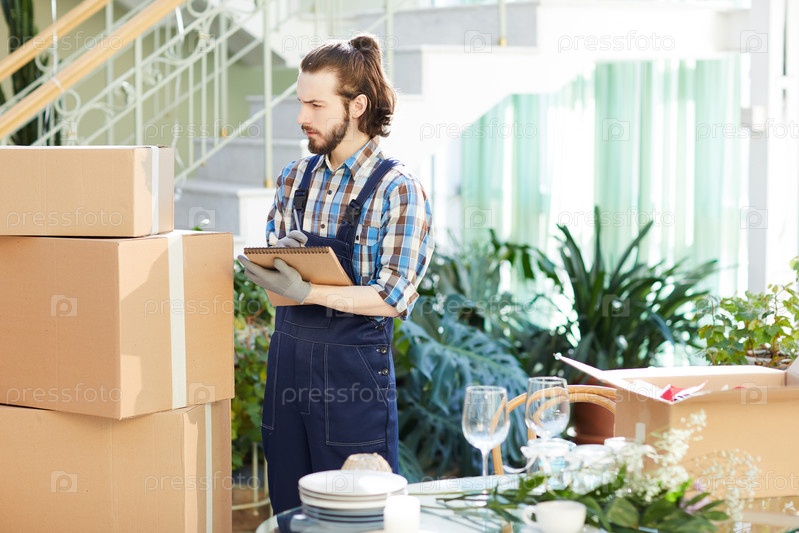 Занятый грузчик, делая заметки