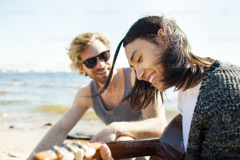 Различные люди играют на гитаре на пляже