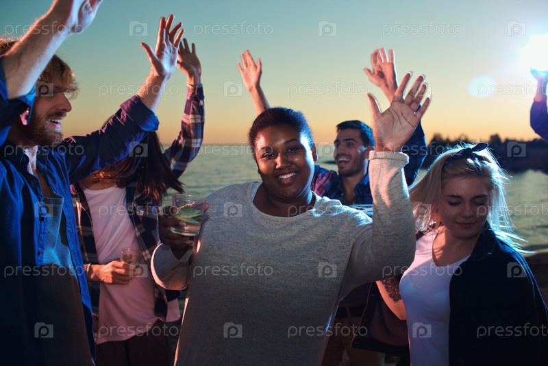 Черная женщина с напитком танцует в кругу друзей