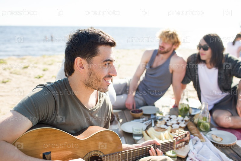 Человек играет на гитаре на пляжной вечеринке