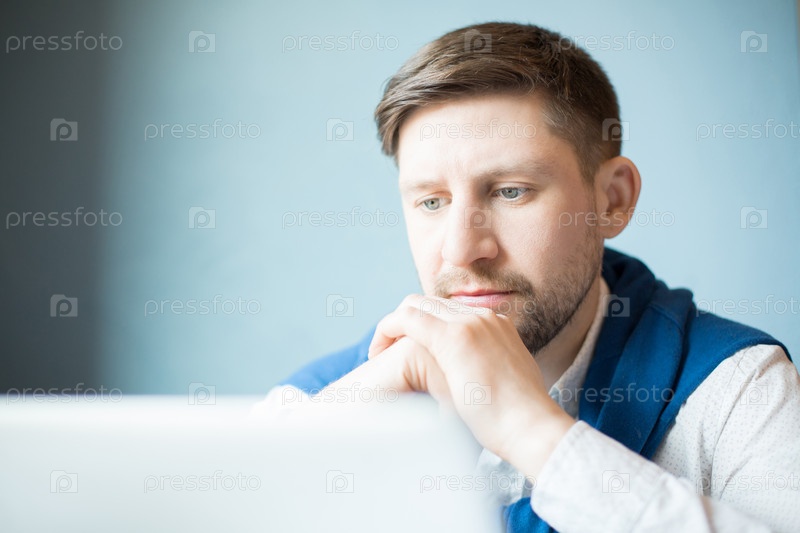 Задумчивый человек, глядя на ноутбук
