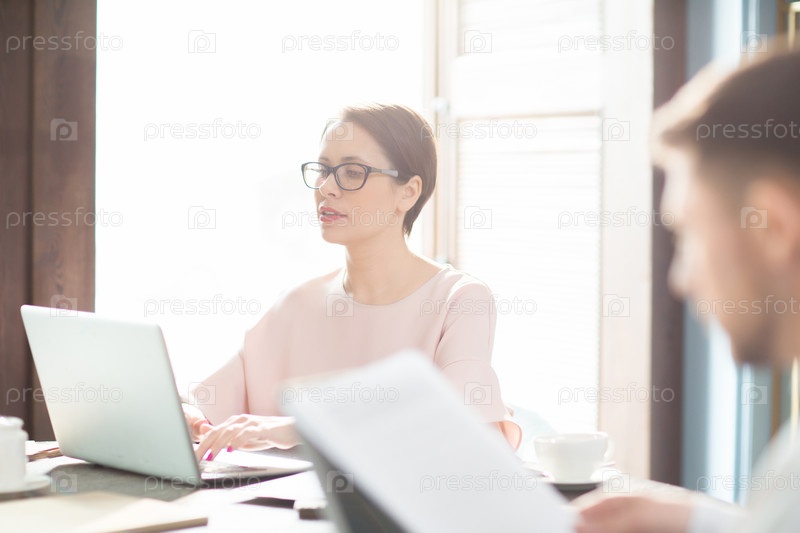 Женщина, используя ноутбук рядом с коллегой