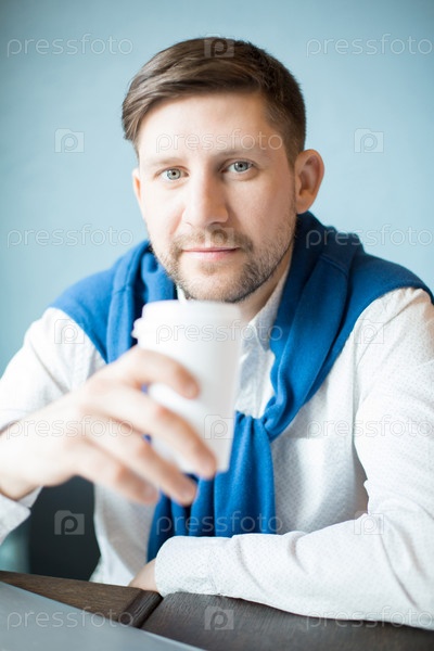 Человек с горячим напитком, глядя на камеру