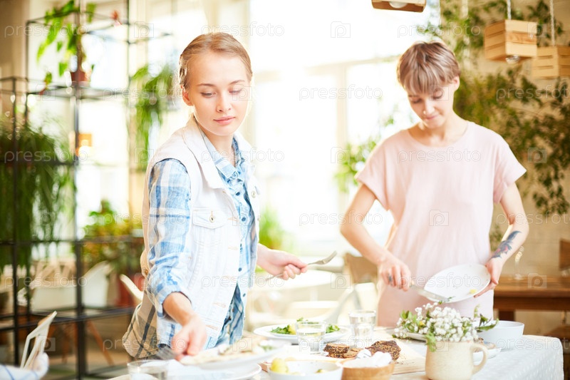 Молодая женщина убирает со стола