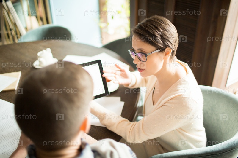 Бизнесмен, показывая планшет коллеге