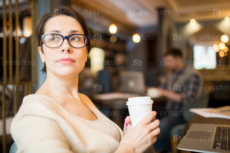 Бизнесмен с горячим напитком, глядя в сторону