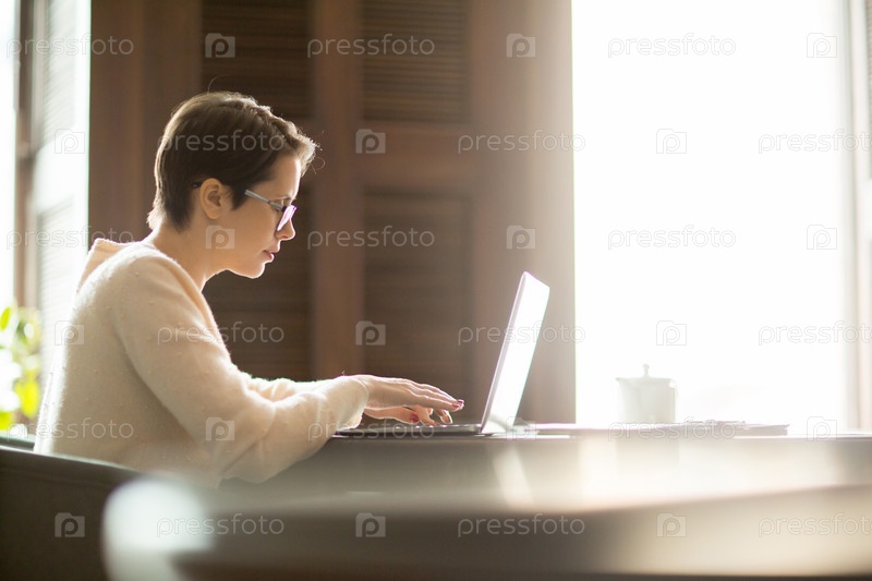 Взрослая женщина, используя ноутбук в кафе