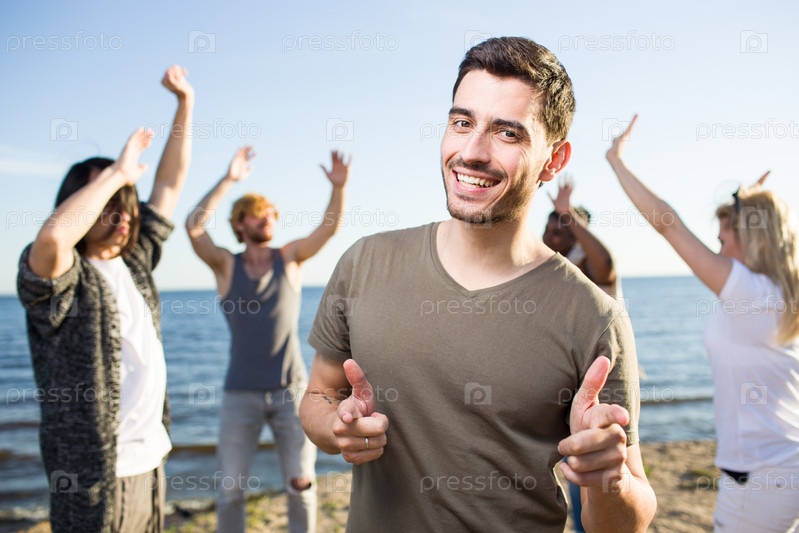 Веселый человек, указывая на камеру на вечеринке