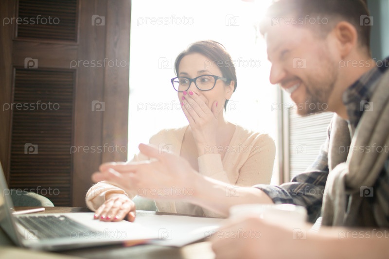 Смеющиеся коллеги, используя ноутбук