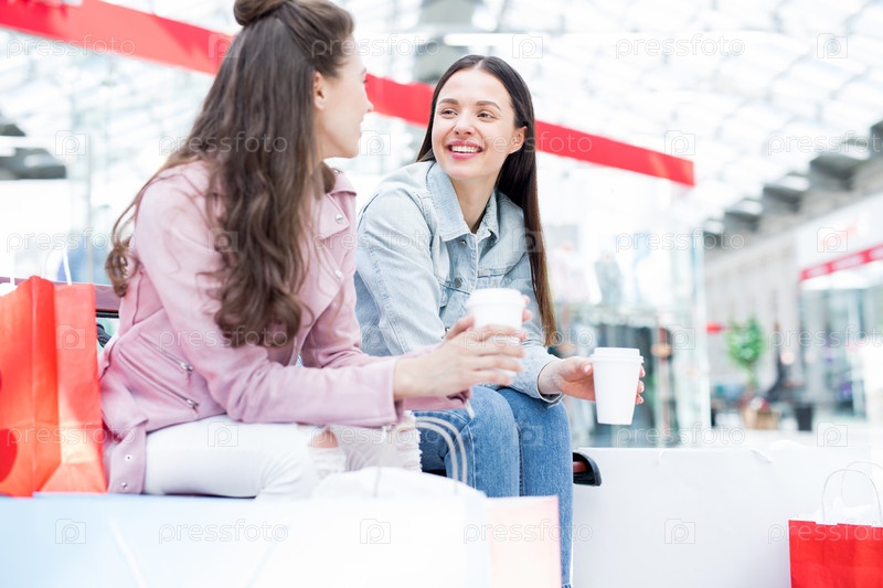 Веселые девушки пьют кофе в торговом центре