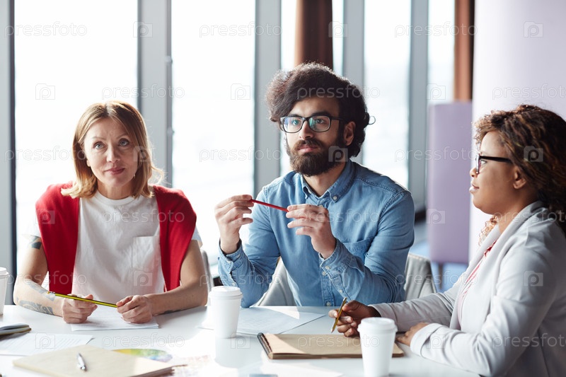 Сконцентрированные дизайнеры смотрят презентацию на заседании