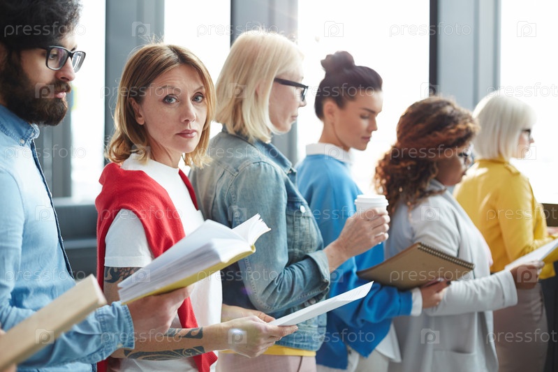 Серьезная женщина в длинной очереди