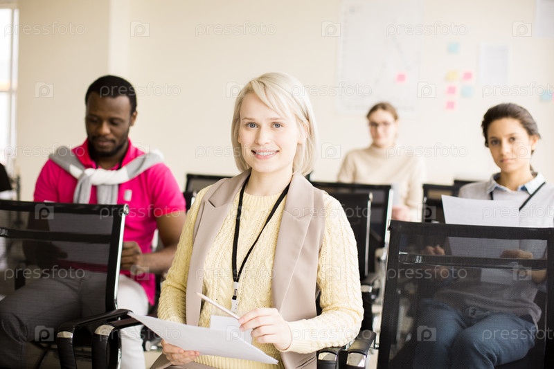 Многонациональная группа людей, держащих бумаги в руках на семинаре