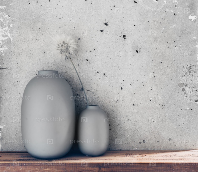 Серые вазы на деревянной полке